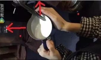 方法很簡單!我們奶缸的姿勢不是垂直于地面的!而是奶缸的頂部不動,底部往左移一點,再往上移一點!(也就是說奶缸是靠右下方傾斜的),但是移動的時候切記上面是不動的喲!蒸汽管要時刻保持在漩渦點上面!