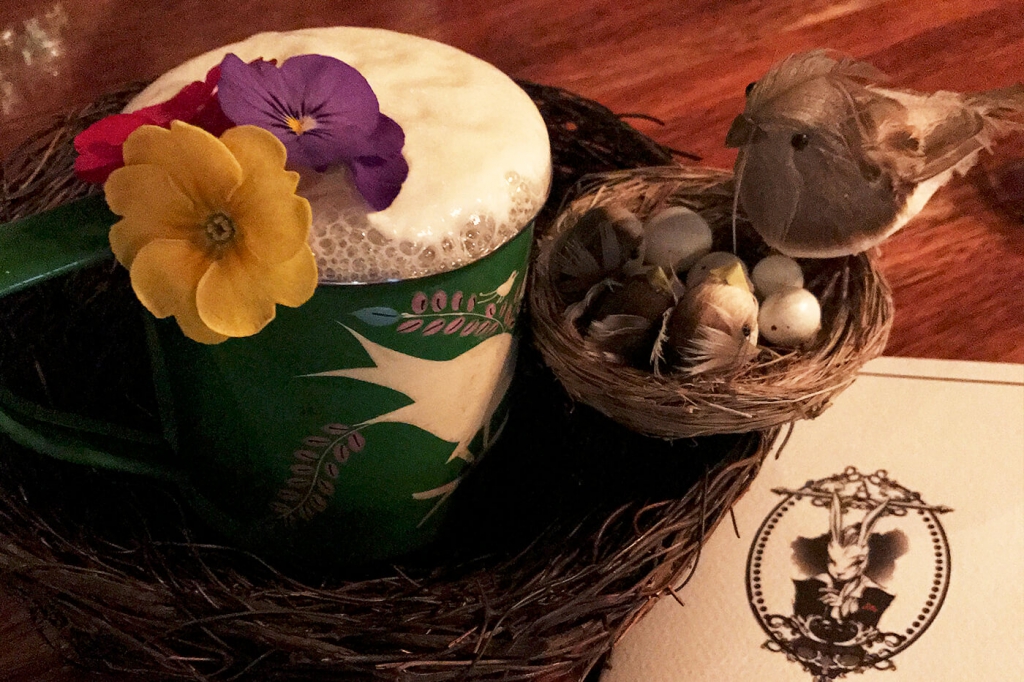 它是如何調制的?酒單上的配方里寫到了羅勒葉浸漬的必富達金酒、菠蘿蜂蜜和IPA泡沫,不過調酒師告訴我里面還用到了檸檬汁。Alice酒吧的雞尾酒出名的地方在它的裝飾,這杯也不例外。可食用花(靈感來自 Marian Beke掌舵Nightjar期間的創(chuàng)意 ),還有裝在“鳥巢”里的巧克力蛋(有著可口糖衣的那種)完整呈現了Birds and Bees所要表達的主題。