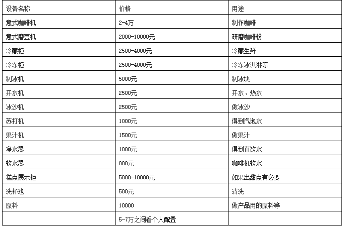 咖啡館設備,這將直接影響咖啡館產品出品的質量的東西,也得認真對待。我下面將所需要的一般性設備做個表格供參考。