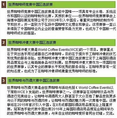 摘要: World Coffee Events(WCE)六大世界級(jí)賽事明年全面登陸中國(guó),中國(guó)區(qū)賽事引進(jìn)方上海博華國(guó)際展覽公司開(kāi)通了報(bào)名通道,各位咖啡師或個(gè)人愛(ài)好者,請(qǐng)抓緊報(bào)名咯!