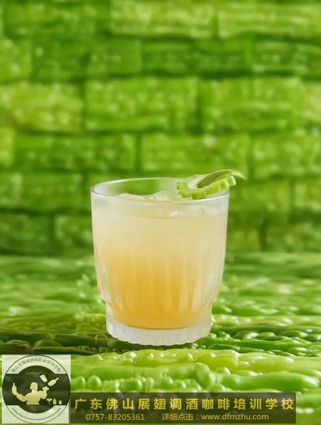 將所有材料搖勻,倒入加冰的洛克杯中。用一個青檸卷和一片苦瓜裝飾。