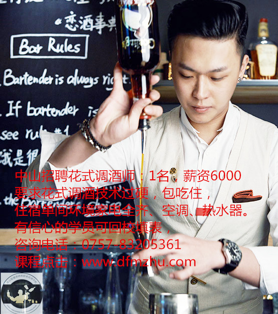中山招聘花式調酒師:1名,薪資6000,要求花式調酒技術過硬,包吃住,住宿單間環境家電全齊、空調、熱水器。有信心的學員可回校填表,咨詢電話:0757-83205361. 課程點擊:www.xmaijite.com